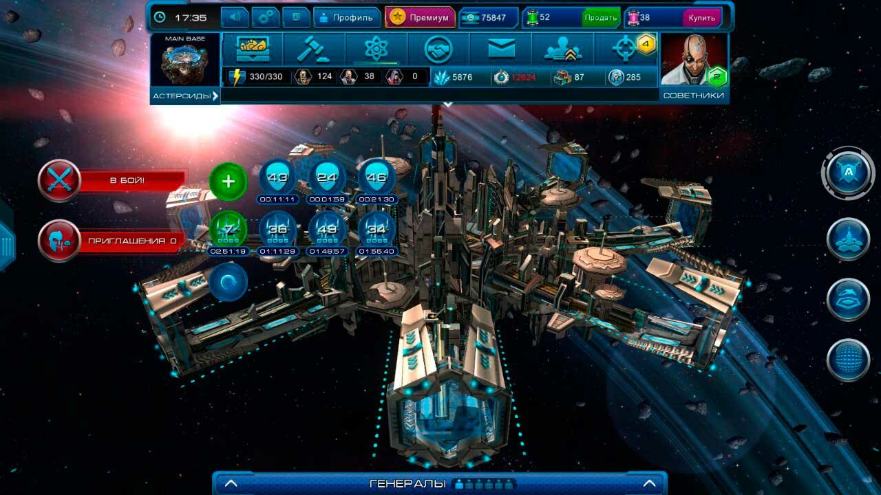 А для командования в мире AstroLords, у правителя астероида есть в подчинении военные генералы. Их можно иметь до 6 человек, которые выбираются из 7 классов. Каждый из генералов также имеет свои характеристики, которые развиваются в ходе игры. У генералов в подчинении есть боевые корабли, мощь которых можно усилить различными рунами и артефактами. Усиливать боевые характеристики кораблей, орбитальной станции и навыков генералов в Астролордс необходимо не только для защиты от других игроков, но и для ведения боев с пришельцами.