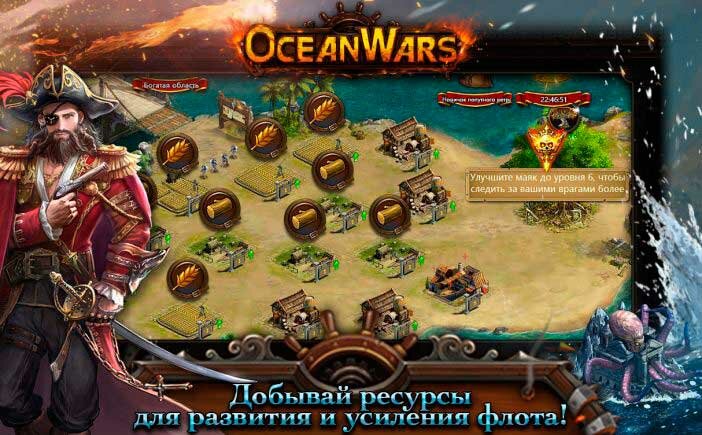 Ocean Wars – это смесь экономической стратегии и морских сражений на парусных кораблях. Доступна игра непосредственно из браузера, а также в соцсетях и на мобильных платформах. Геймплей ее во многом схож с Travian, Clash of Kings и другими подобными популярными MMORPG. А уникальной ее делает в первую очередь сеттинг, пропитанный свежим морским воздухом и атмосферой пиратской свободы.