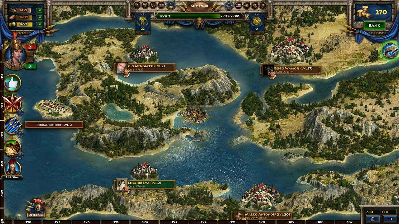 Потому как Спарта: война империй относится к жанру онлайн стратегий, то и начинать придётся с основ. Причём, основ экономики. В распоряжение игрока поступает целый город, который нужно защищать, снабжать провизией и ресурсами. Основными обменными валютами служат зерно, древесина и бронза: именно этот товар и будет ходовым на протяжении долгого пути к господству. Первые квесты направлены как раз на создание производящих построек: ферма, кузница и лесопилка на современном языке дадут минимальный рост запасов. В дальнейшем, каждое из зданий может быть улучшено для получения большей прибыли.